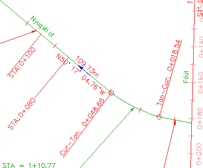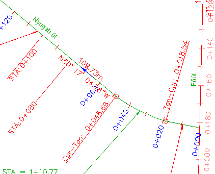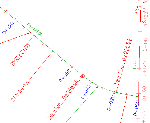 Észrevehető, hogy az STA:0+080 and STA:0+100 feliratok, melyeket a 2. gyakorlat: Gyermek feliratstílus használata részben módosított, még mindig láthatók. Ennek oka, hogy a főszelvényfeliratok fennmaradó része a Osztójelre merőleges stílust használja, amely a 0 fóliára hivatkozik. Az STA=0+060 és STA=0+080 feliratok a Vonalra merőleges és a Szelvény kiemelése stílust használják, amely a C-ROAD-LABL fóliára hivatkozik.