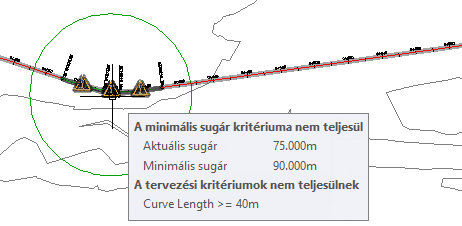 jel jelenik meg az egyes, tervezési kritériumoknak nem megfelelő paraméterek mellett. Ahogy a rajzablakban és a Nyomvonal rajzelemek nézetben is igaz, megjelenik a megszegett tervezési kritérium, de az egyes nem megfelelő paraméterek nincsenek jelölve.