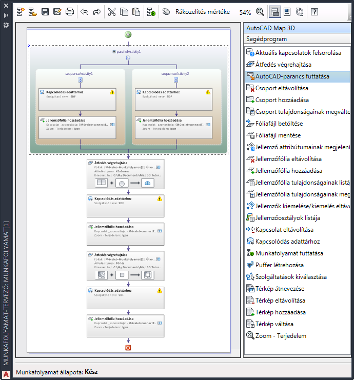 A Munkafolyamat-tervező jobb oldalán lévő Művelet panel a műveletek két kategóriáját tartalmazza. Az AutoCAD Map 3D eszközkészlet program műveletei AutoCAD Map 3D eszközkészlet-specifikusak (beleértve az AutoCAD parancsokat futtató műveleteket is).
