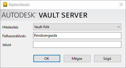 - Adja meg a Vault rendszergazdai fiókhoz tartozó felhasználónevet és jelszót. Ha Windows Active Directory hálózatot használ, ez az információ automatikusan megjelenik.