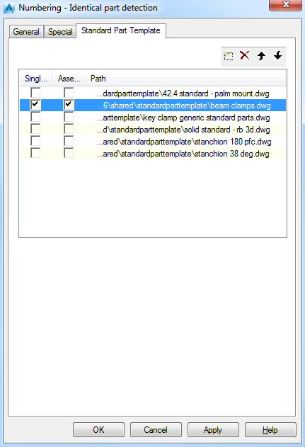This tab lists the standard part models linked to the current project. Each standard part template can be used for the single part, assembly detection or both.