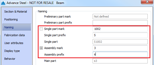 The single part and assembly marks are shown together with their prefixes on the Naming tab of the element properties dialog box.