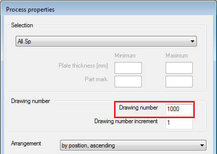 - In the Process properties dialog, use the Drawing number field to set your drawing number as needed, this will become the part number. In this example, the set drawing number is 1000: