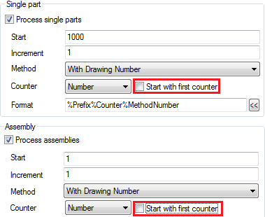 Note: In the Format field you can see the format of the information for parts and assemblies. Here, you can add text type values or other tokens to fit your needs. The default format is: %Prefix%Counter%MethodNumber.
