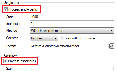 - As for single parts, in the Process properties dialog, use the Drawing number field to set your drawing number as needed, this will become the assembly (main part) number. In this example, the set drawing number is 100.