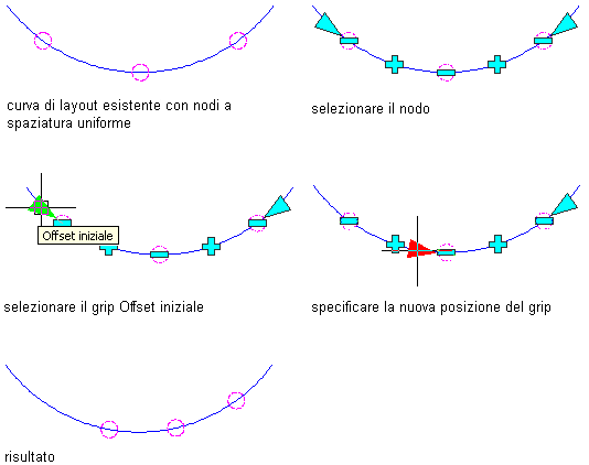 È possibile modificare gli offset di curve di layout a spaziatura uniforme e ripetuta. Modificando la posizione dei grip Offset è possibile spostare l'offset iniziale o finale in qualsiasi punto della curva di layout. Non è possibile estendere l'offset oltre i limiti della curva.