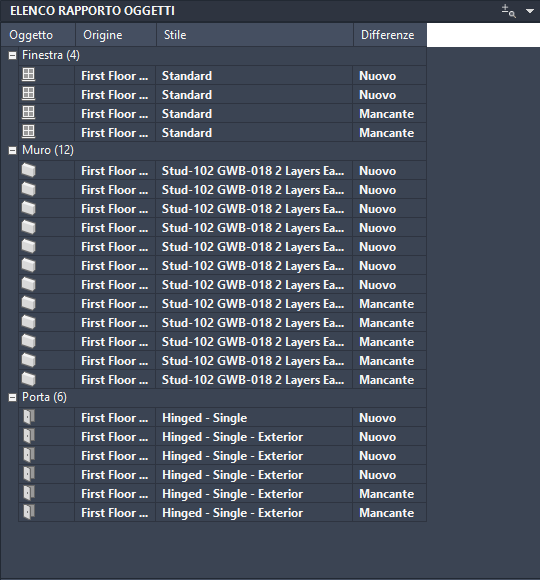 Confronto di disegni è in grado di identificare gli oggetti modificati, aggiunti o rimossi nei disegni di revisione. Agli oggetti vengono assegnati colori diversi in base al relativo stato (modificato, nuovo o mancante) e viene generato un elenco delle modifiche rilevate.