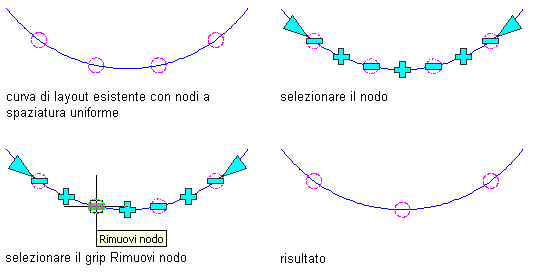 - Se si rimuove un nodo da una curva di layout con nodi a spaziatura uniforme, il nodo viene rimosso dalla posizione specificata, mentre gli altri nodi vengono ricalcolati in modo da ripristinare la spaziatura uniforme.