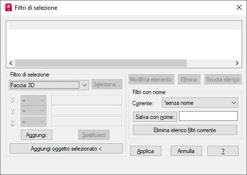 Consente di selezionare, modificare e assegnare i nomi ai filtri per la selezione degli oggetti.