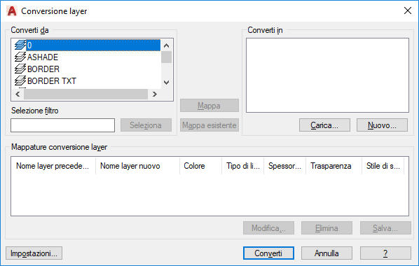 Specifica i layer da convertire nel disegno corrente. È possibile specificare i layer selezionandoli dall'elenco Converti da o specificando un filtro di selezione.