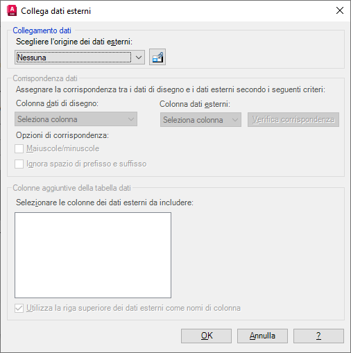 Visualizza i nomi di colonna nell'ordine in cui vengono visualizzati nel foglio di calcolo. Le colonne selezionate sono collegate ai dati del disegno mediante una corrispondenza dati.