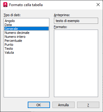 Visualizza un elenco dei tipi di formato appropriati al tipo di dati selezionato. Se, ad esempio, si seleziona Angolo come tipo di dati, verranno visualizzate opzioni quali Gradi decimali, Gradi centesimali, Radianti e così via.