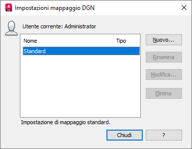 Crea, rinomina, modifica ed elimina le impostazioni di mappaggio per l'importazione o l'esportazione di dati DGN.