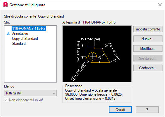 La quota viene aggiornata come previsto. Ma ancora meglio, se lo stile di quota non esiste, viene creato nel disegno. Verificare questa impostazione utilizzando il comando DIMSTILE. Trova