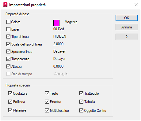 Le proprietà speciali applicano proprietà specifiche del tipo di oggetto di origine. Per gli oggetti quota includono lo stile di quota e altro ancora.