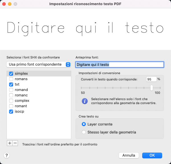 - Usa primo font corrispondente. I font selezionati vengono confrontati con la geometria SHX selezionata per una corrispondenza a partire dall'inizio dell'elenco fino a quando la percentuale di impostazione della conversione specificata non viene raggiunta o superata.