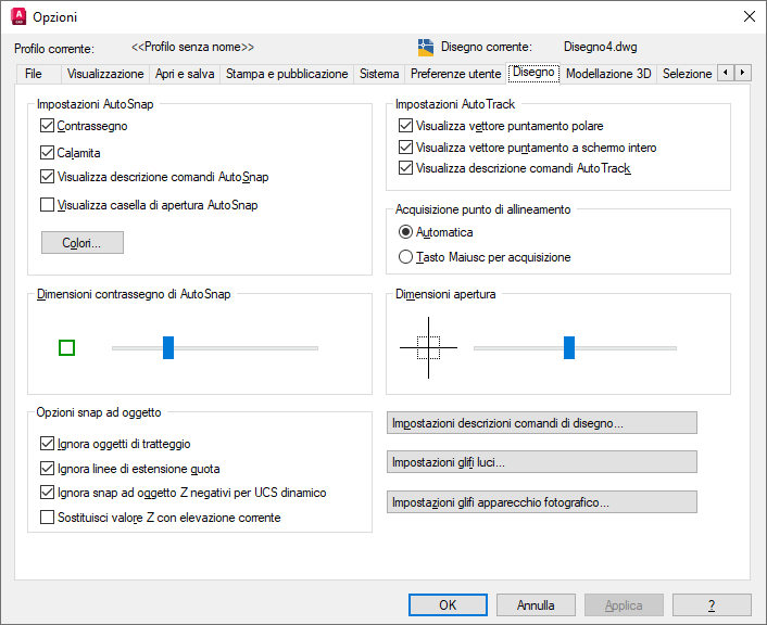 Imposta le opzioni per diverse funzioni di modifica, tra cui AutoSnap e AutoTrack.