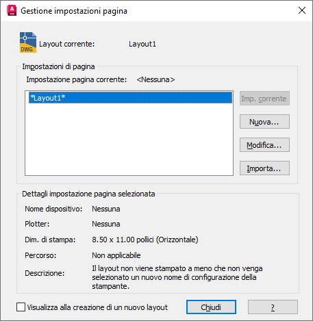 Specifica che la finestra di dialogo Imposta pagina viene visualizzata quando si seleziona una nuova scheda di layout o si crea un nuovo layout.