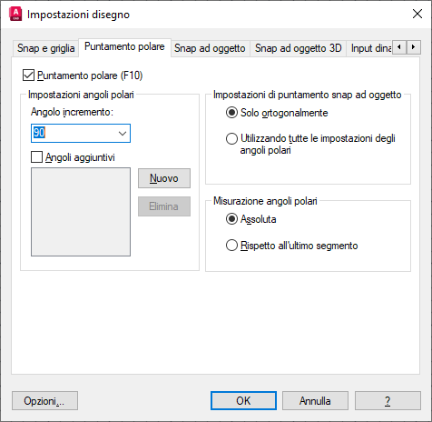 Rende disponibili per il puntamento polare gli angoli aggiuntivi specificati nell'elenco. (Variabili di sistema POLARMODE e POLARADDANG)