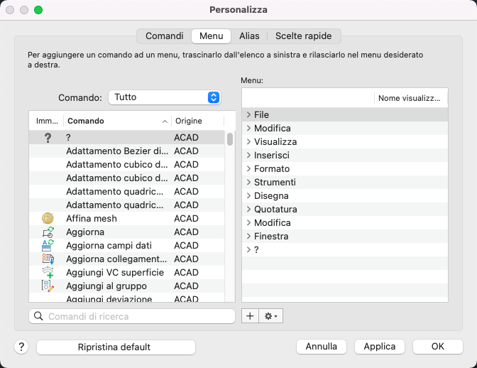 Trascinare il comando nella posizione desiderata nel menu e rilasciarlo. La posizione del comando è indicata dalla barra orizzontale. Se si posiziona il cursore su un menu o un sottomenu durante il trascinamento di un comando, il menu o il sottomenu si espanderà dopo un breve intervallo.