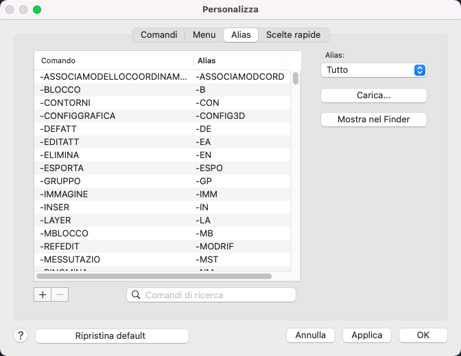 - È possibile visualizzare tutti gli alias dei comandi oppure solo quelli personalizzati.