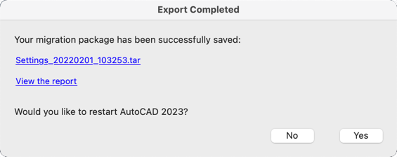 L'utilità crea un file ZIP contenente le impostazioni e i file personalizzati esportati che è possibile quindi importare in un altro computer. Ogni computer deve eseguire la stessa versione di AutoCAD o AutoCAD LT.