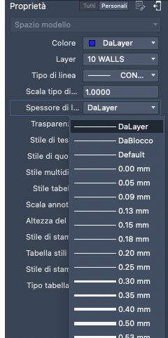 La proprietà Spessore linea consente di visualizzare spessori differenti per gli oggetti selezionati. Lo spessore delle linee rimane costante indipendentemente dalla scala della vista. In un layout, gli spessori di linea vengono visualizzati e stampati in unità reali.