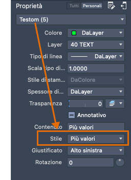 Come per altre funzionalità di annotazione, per il testo multilinea sono disponibili numerose impostazioni. È possibile salvare queste impostazioni come stile di testo mediante il comando STILE, quindi accedere agli stili di testo salvati facendo clic sulla freccia dell'elenco a discesa Stile di testo nella tavolozza Analisi proprietà. Lo stile di testo corrente viene visualizzato nella tavolozza Analisi proprietà quando non è selezionato alcun oggetto.