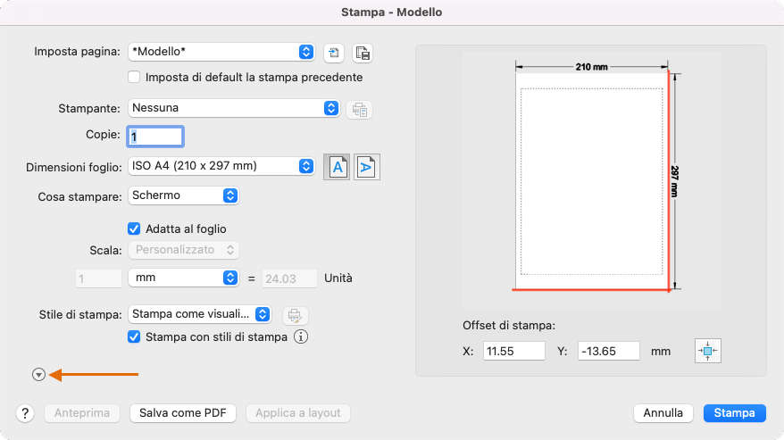 Per controllare se tutte le opzioni nella finestra di dialogo Stampa sono nascoste o visualizzate, fare clic sulla freccia indicata per espandere l'elenco delle opzioni.