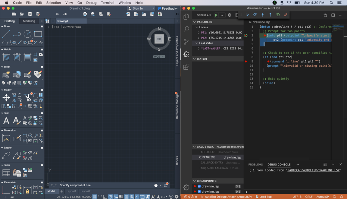 - Eseguire le istruzioni di codice AutoLISP e i comandi di AutoCAD nella console di debug