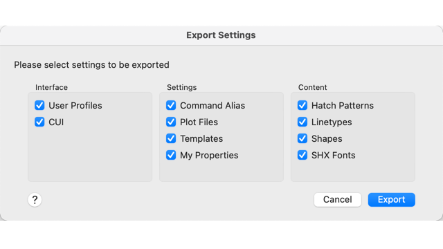 È possibile trasferire le impostazioni da un computer ad un altro. Le impostazioni possono includere le personalizzazioni del profilo utente, della barra degli strumenti e dell'insieme di strumenti, gli alias dei comandi, le impostazioni di stampa, i modelli e le impostazioni di Proprietà personali per la tavolozza Proprietà.