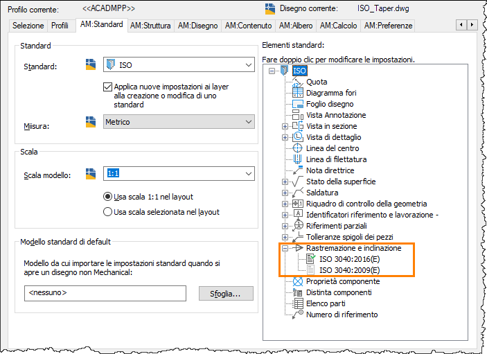 Nel Set di strumenti AutoCAD Mechanical 2024, quando si apre un disegno di versioni precedenti, lo standard di default viene riportato alla revisione standard precedente. È possibile modificare la revisione standard nella finestra di dialogo Opzioni.