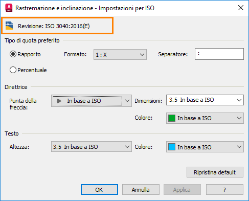La nuova revisione viene visualizzata nella finestra di dialogo Impostazioni rastremazione e inclinazione per ISO.