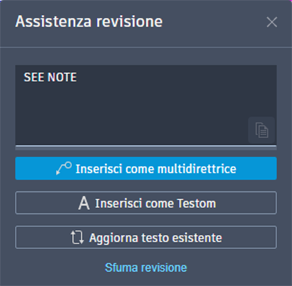 Assistenza revisione identifica il testo nella revisione importata che può essere inserito nel file di disegno come testo multilinea o come oggetto multidirettrice oppure utilizzato per aggiungere o sostituire il testo esistente nel disegno.