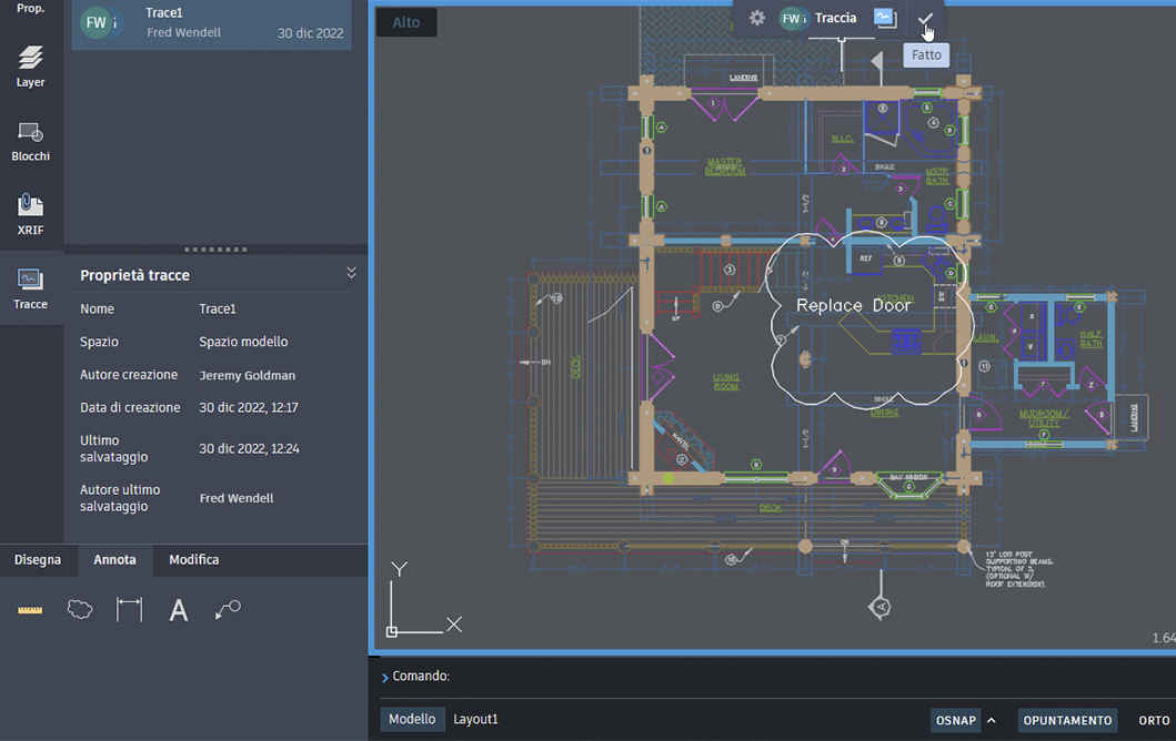Quando i colleghi aprono il disegno nella versione desktop di AutoCAD (Windows o Mac), vengono informati di eventuali nuove tracce. I destinatari possono aprire la traccia per vedere gli elementi aggiunti, quindi prendere decisioni sui commenti inclusi.
