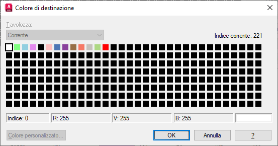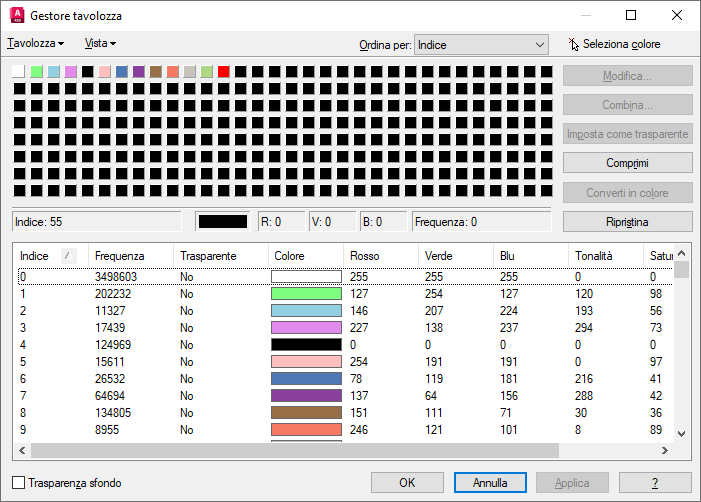 Fare clic su Combina. Nella finestra di dialogo Colore di destinazione, fare clic sul quadratino bianco, quindi su OK. Nota: In base alla modifica visualizzata nella colonna Frequenza della tabella, tutti i colori presentano ora una frequenza pari a 0, ad eccezione degli indici 0 e 8.