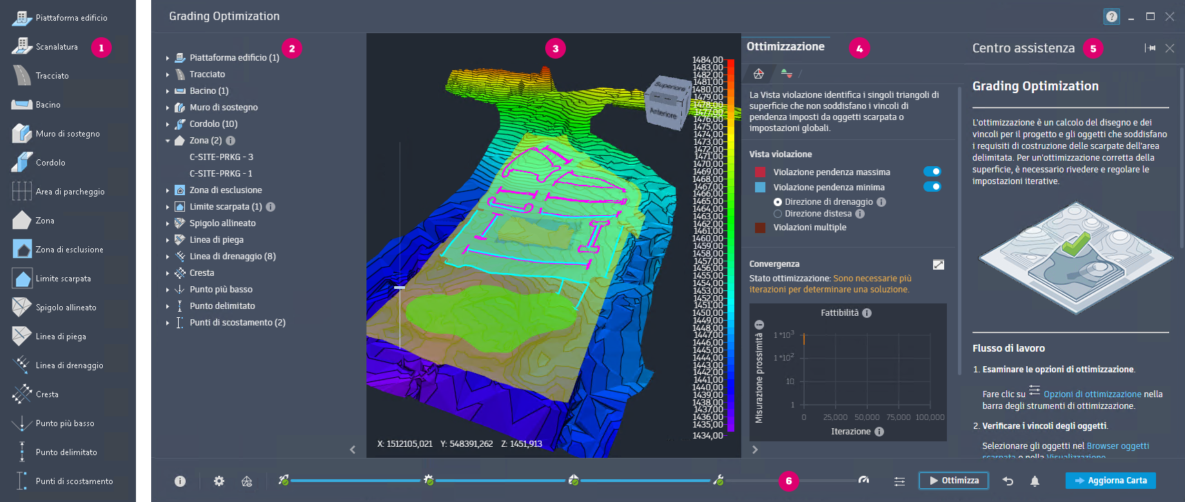 Help Center - Questo gruppo fornisce una guida contestuale mentre si lavora in Grading Optimization. Sono inoltre disponibili flussi di lavoro, Carte di esempio e collegamenti a contenuti di apprendimento pertinenti.