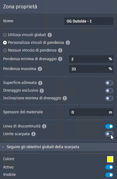 Grading Object Tool Palette - Questa tavolozza degli strumenti di Civil 3D consente di assegnare indicatori agli elementi della Carta come oggetti scarpata per l'ottimizzazione. Ogni oggetto elencato contiene dati di vincolo di default. È possibile fare clic con il pulsante destro del mouse su uno strumento oggetto per modificare i valori di default applicati quando si utilizzano o si creano altri oggetti personalizzati.