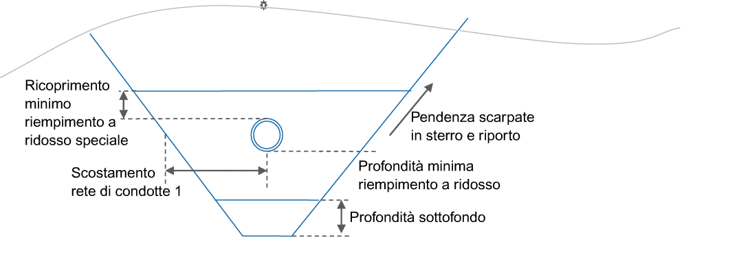 Quando sono selezionate due reti di condotte, si presupporrà che Rete di condotte 1 sia sul lato sinistro della linea base e Rete di condotte 2 sul lato destro del tracciato. Lo spessore del materiale di Spessore minimo riempimento speciale è determinato dal più elevato dei due diametri esterni della condotta, oltre allo spessore di Ricoprimento minimo riempimento speciale. Lo spessore del fondo della trincea è determinato dal più basso dei due diametri esterni della condotta, oltre a Spessore minimo riempimento speciale e Spessore del sottofondo.
