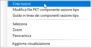 - È stata aggiunta la possibilità di creare una nuova istanza di un file PKT di componenti sezione tipo nella Carta dal menu contestuale del componente sezione tipo nella struttura Prospetto. Fare clic con il pulsante destro del mouse su un componente sezione tipo e selezionare Crea nuovo per inserire una nuova istanza del componente sezione tipo nella Carta, associata ad una sezione tipo esistente o dissociata. È inoltre possibile utilizzare questo comando per sostituire un componente sezione tipo esistente nella Carta.