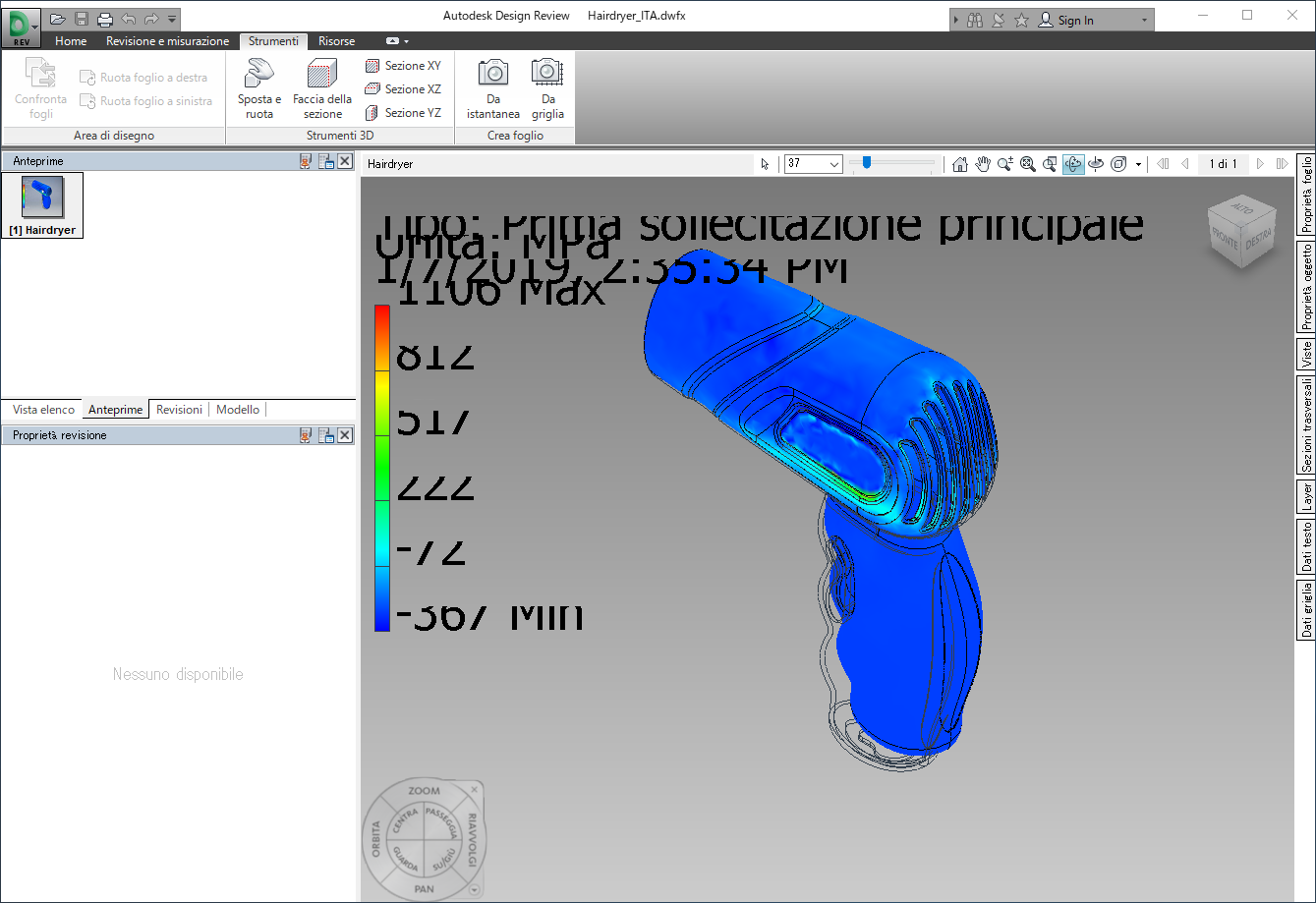 Nella barra del browser della simulazione, selezionare e visualizzare i risultati che si desidera vedere o stampare in Autodesk Design Review.