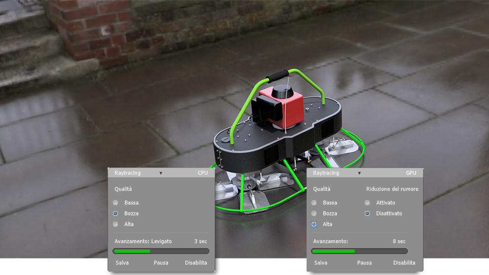 Opzione raytracing. Selezionarla per utilizzare il raytracing GPU. Se la macchina non dispone di un GPU qualificato, l'opzione non è disponibile.