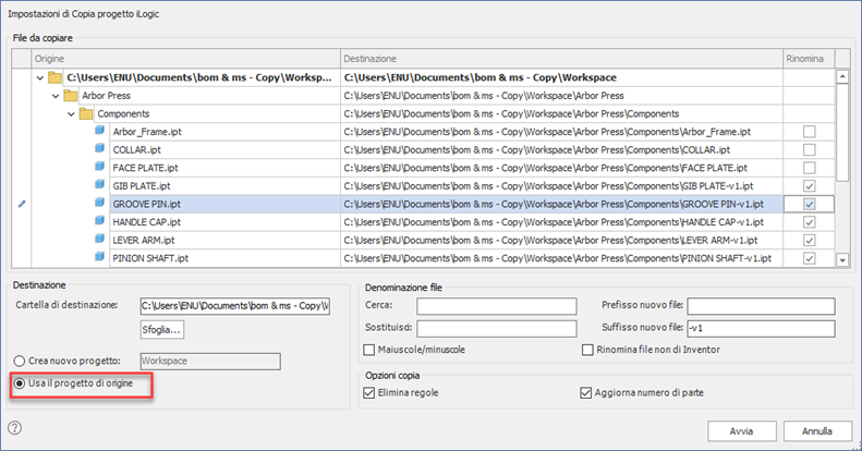 Ora è possibile riutilizzare i file senza copiarli e creare un nuovo file di progetto. Se la cartella di destinazione è la stessa della cartella di origine, selezionare l'opzione "Usa il progetto di origine" nella finestra di dialogo Impostazioni di Copia progetto iLogic e specificare il prefisso o il suffisso desiderato oppure le opzioni Trova e sostituisci per rinominare i file. Quindi, deselezionare l'opzione Rinomina per i file specifici che non si desidera rinominare.