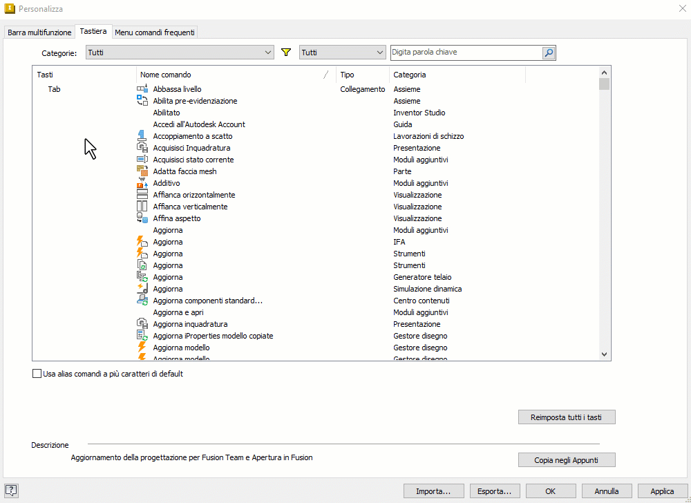 Per ulteriori informazioni, vedere Come utilizzare gli alias comandi e i tasti di scelta rapida personalizzati.