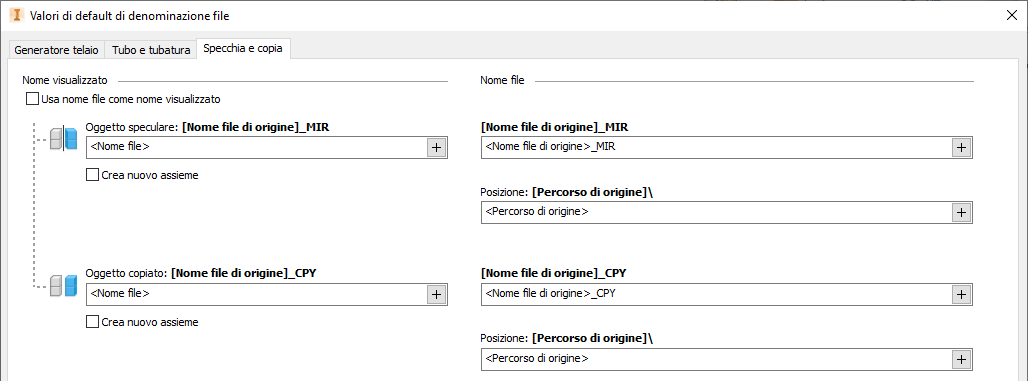 finestra di dialogo Valori di default di denominazione file includono ora una scheda Specchia e copia, in cui è possibile specificare il modo in cui Specchia e copia crea file e cartelle. Ad esempio, è possibile utilizzare queste impostazioni per mantenere la struttura di cartelle piatta ed eliminare completamente la sottodirectory. Inoltre, ora è possibile configurare lo schema di denominazione utilizzando le opzioni Nome visualizzato e Nome file.