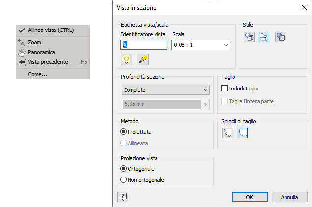 Quando si crea una vista in sezione, per default la vista viene allineata alla vista primaria. Utilizzare il nuovo menu contestuale, Allinea vista, per disabilitare la proiezione ortogonale dalla vista di base. È inoltre possibile utilizzare le nuove opzioni Proiezione vista nella finestra di dialogo Vista in sezione per controllare la creazione della vista in sezione.