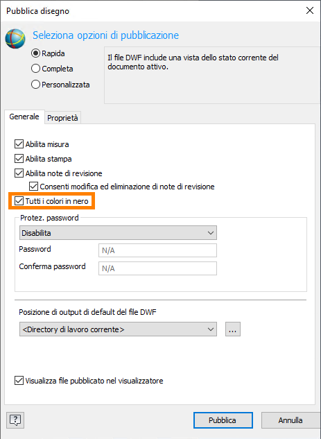 Ora è possibile impostare Tutti i colori in nero durante l'esportazione di un disegno 2D come file DWF per evitare problemi con determinati colori.