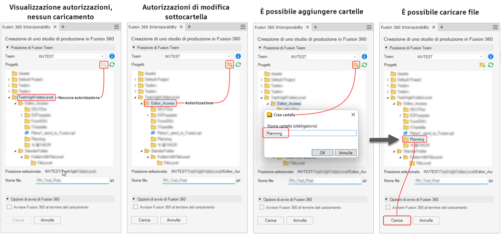 Le autorizzazioni a livello di cartella migliorano la collaborazione tra Inventor e Fusion. Ciò consente ai proprietari dei progetti di permettere ad altri utenti che lavorano ad un progetto di aggiungere sottocartelle e di caricare file da utilizzare con gli strumenti di Fusion 360, quali Progettazione generativa, Simulazione e Produzione.