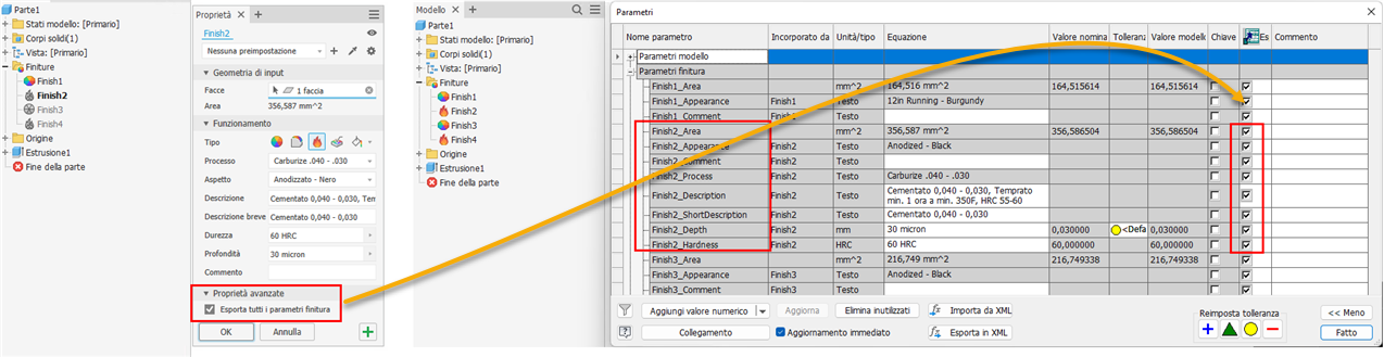 Ora è più semplice selezionare tutti i parametri di finitura contemporaneamente per l'esportazione. La casella di controllo Esporta tutti i parametri di finitura viene aggiunta alla sezione Proprietà avanzate del gruppo Proprietà. Quando è selezionata, tutti i parametri di finitura vengono selezionati automaticamente per l'esportazione in iProperties personalizzate.