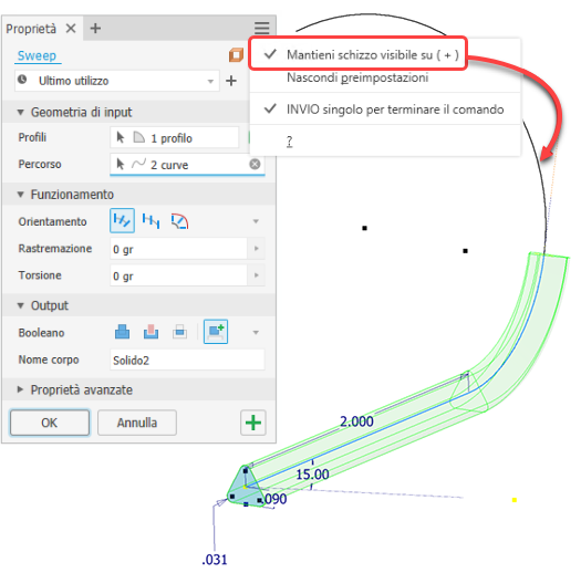 Quando si utilizza il comando Sweep, è possibile mantenere visibile lo schizzo della traiettoria durante l'utilizzo di Applica per creare un segmento di sweep. Nel gruppo Proprietà - Sweep, nel menu Impostazioni avanzate, selezionare l'opzione Mantieni schizzo visibile su ( + ).